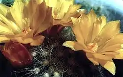 | Квіти | великі, широко розкриваються, воронкоподібні, яскраво-жовті, з приємним ароматом, 25-30 мм завдовжки і в діаметрі (за даними К. Марсдена „Книга кактусів“ — 2-2,5 см завдовжки і 1 см в діаметрі), з зеленими рильцями. Внутрішні пелюстки вузькі, блискучі і жовті. Зовнішні пелюстки ланцетоподібні, жовті або зеленуваті з жовтою центральною лінією. Добре цвіте у квітні-травні, але іноді цвіте в серпні. |