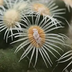 | Радіальні колючки | 17-45, тонкі, скловидно-білі з жовтою основою, трохи зігнуті, до 2 мм завдовжки. |