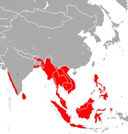 Країни проживання: Бангладеш, Бруней-Даруссалам, Камбоджа, Індія, Індонезія, Лаос, Малайзія, М'янма, Філіппіни, Сінгапур, Шрі-Ланка, Таїланд, В'єтнам. У Південній Азії цей вид був записаний до висоти 1600 м над рівнем моря. Зустрічається у вологих районах і густих тропічних вологих лісах.