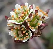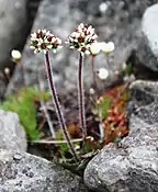Це поодинокі багаторічні трав'янисті рослини, прості чи з короткими вертикальними гілками, кожна закінчується розеткою листя на рівні землі. Квіткові стебла прямостійні, (4)5–15(20) см, по одному з розеток 1–2(2.5) мм товщиною запушені довгими волосками, часто завдовжки з діаметр стебла. Волоски білі але часто з фіолетовими залозистими кінчиками. Листки чергові, всі базальні в розетках, 3–4 × 1.5–2 см; пластини від широкояйцевидої до закругленої форми, з тупими зубцями, шкірясті, сірувато-зелені, часто червонуваті, особливо внизу, рідко волохаті, звужуються більш-менш різко до коротких, крилатих черешків. Суцвіття — 1–5 (або більше) кластерів, кожен з 1–4 (або більше) квітів у короткій, часто головчастій волоті. Квіти радіально-симетричні з 5 вільних чашолистків і пелюсток. Чашолистки 1.3–2.3 × 1.3–2.3 мм, від широкояйцевидих до трикутних, тупі, від зеленого до червонуватого забарвлення. Пелюстки 2.5–3.2 × 1.0–1.3 мм, в 1.5–2 рази довші за чашолистки, вузько довгасті, від тупих до округлих, не перекриваються, білі або рідше блідо-рожеві. Тичинок 10. Плоди — 2-дольні капсули з двома дзьобами вигнутими до 90° назовні при дозріванні, зелені, стаючи від червонуватих до пурпурних при дозріванні. Насіння численне.