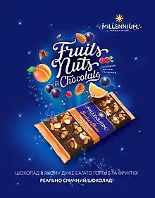 - Шоколад Millennium. Асортимент налічує багато підвидів: Golden Nut (шоколад з цільним горіхом), Favorite (плитки з часткою какао 70 % — 80 %), Air (пористий), Discover Europe (тематичний шоколад, присвячений країнам Європи) та ін.