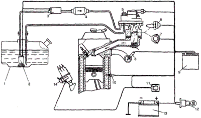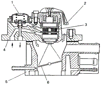 - 2). На холодному двигуні вмикається регулятор керуючого тиску. Біметалева пластина регулятора стискає пружину діафрагмового клапана, відкриваючи канал зливання палива, що зменшує протидію на плунжері розподільника. Зменшення керуючого тиску за незмінної витрати повітря спричиняє збільшення ходу напірного диска. Внаслідок цього розподільний плунжер додатково трохи піднімається, збільшуючи кількість палива, що подається до форсунок.