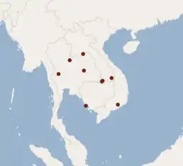 Цей вид широко поширений в Таїланді, В'єтнамі, Лаосі та Камбоджі. Живе у вічнозелених і напів-вічнозелених лісах між 100 і 400 метрів над рівнем моря.