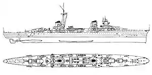 | Зенітне озброєння | 8 (4 × 2) × 100-мм зенітних гармат 100 mm/47 OTO 8 (4 × 2) × 37-мм зенітних гармат Breda 37/54 8 (4 × 2) × 13,2-мм зенітних кулеметів Breda 1931[1] | |