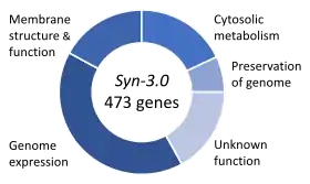 У 2016 році Інститут Вентера використав гени з JCVI-syn1.0 для синтезу меншого геному, який вони називають JCVI-syn3.0, який містить 531560 пар основ і 473 гени[b 7]. У 1996 році, порівнявши M. genitalium з іншою невеликою бактерією Haemophilus influenza, Аркадій Мушегян та Євген Кунін припустили, що може існувати загальний набір з 256 генів, який може бути мінімальним набором генів, необхідним для життєздатності[b 8][a 19]. У цьому новому організмі кількість генів можна зменшити лише до 473, 149 з яких мають функції, які абсолютно невідомі[b 8]. У 2019 році була опублікована повна обчислювальна модель усіх шляхів у клітині Syn3.0, що представляє першу повну модель in silico для живого мінімального організму[a 20].