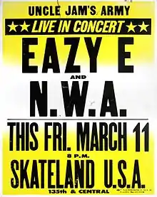 - Eazy-E — засновник N. W. A. і власник лейблу Ruthless Records. Після того, як його вигнали з 10 класу середньої школи, почав торгівлю наркотиками, що дало йому великий прибуток. На ці гроші він разом з Джеррі Хеллером заснував N. W. A.[2][3]. Після приголомшуючого успіху альбому Straight Outta Compton з групи пішов Ice Cube. Після цього Eazy стає фактичним лідером групи. Після випуску Niggaz4Life і відходу Dre група остаточно розпадається, а ворожнеча між Eazy-E і Dr. Dre вирувала протягом декількох наступних років.