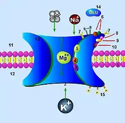Іон магнію віддаляється при деполяризації постсинаптичної мембрани, на якій знаходиться рецептор. Одночасно з цим для функціонування рецептора в синаптичну щілину повинен потрапити глутамат. Така активація рецептора викликає відкриття іонного каналу, неселективного до катіонів, що веде до притоку в клітину Na+ і, в невеликому об'ємі, Ca+2, а K+ покидає клітку. Іони кальцію, що увійшли через канал, активують білкову кіназу CAMK-II. Відбувається її автофосфорилювання і фосфорилювання ряду білків нейрона-реципієнта.