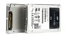 - Intel Ruler SSD (EDSFF) — форм-фактор для серверних накопичувачів з підтримкою гарячої заміни. Був анонсований компанією Intel в 2017 році на Flash Memory Summit[28]. Форм-фактор U.2 забезпечував механічну сумісність з корпусами, призначеними для установки дисків 2,5", але не дуже добре підходив для твердотільних накопичувачів — обмежені габарити ускладнювали нарощування обсягу накопичувачів і утруднювали охолодження. Розміри накопичувачів EDSFF складають 325,35×9,5×38,6 мм, підтримується підключення через 4 або 8 ліній PCIe (в перспективі — до 16). Прикладами готових продуктів, що використовують форм-фактор EDSFF є сервери і JBOF-системи[прим. 4] виробництва Supermicro, що дозволяють розмістити до 32 накопичувачів в корпусі висотою 1U[29].