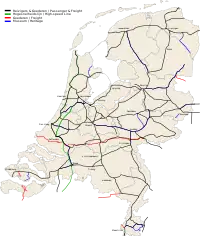 Залізнична інфраструктура підтримується компанією ProRail, яка була відділена від Nederlandse Spoorwegen в 2003 році. Вантажні перевезення раніше здійснювала компанія NS Cargo, яка в 2000 році була приєднана до DB Schenker.[5] Nederlandse Spoorwegen забезпечує курсування 4800 потягів на день, які обслуговують близько 1.1 мільйона пасажирів. Компанія здійснює перевезення з Нідерландів до інших європейських країн, а також здійснює перевезення в деяких інших країнах через дочірню компанію Abellio.
