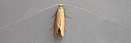 Розмах крил 13-16 мм[2]. Тіло та крила сірувато-вохристого забарвлення. Голова блідо-помаранчева. Вусики жовті та довгі, у самців втричі довші за переднє крило, у самиць — вдвічі довші.[3]