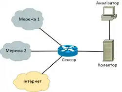 - Сенсор. Збирає статистику по трафіку, що через нього проходить. Зазвичай це L3-комутатор або маршрутизатор, хоча можна використовувати сенсори, які і окремо стоять, вони отримують дані шляхом зеркалювання порту комутатора.