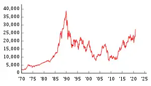 Логарифмічний графік індексу Nikkei 225 в 1970—2020 рр.