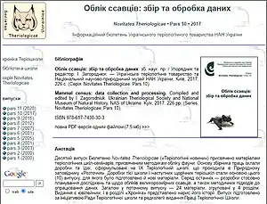 - Загороднюк І. Історія видання Novitates Theriologicae. Облік ссавців: збір та обробка даних: зб. наук. пр. Українське теріологічне товариство та Національний науково-природничий музей НАН України, Київ, 2017. С. 218–225. (Серія: Novitates Theriologicae. Pars 10).