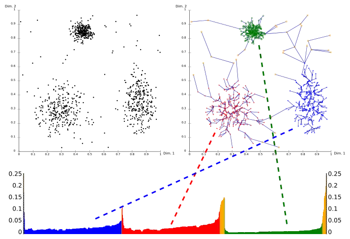 Зображення вище ілюструє цю концепцію. У верхній лівій частині, показано штучний набір даних. Верхня права частина візуалізує сполучне дерево, створене за допомогою OPTICS, і нижня частина показує ділянку досяжності, обчислену OPTICS. Виявлення кластерів з допомогою цього графіку може бути зроблене вручну, вибравши діапазон на осі Ох після візуального огляду, вибравши поріг на осі Оу (результат буде схожий на результат DBSCAN кластеризації з тимb ж і minPts параметри, тут значення 0,1 може дати добрі результати), або за допомогою різних алгоритмів, які намагаються виявити ділянки, використовуючи крутизну, виявлення коліна або локальні максимуми. Кластери, отримані таким чином можуть мати ієрархічну структуру, чого не може бути досягнуто за допомогою DBSCAN.