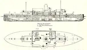 Корабель мав довжину 73,4 метра із міделем 14,78 метрів. Осадка складала 5 метрів, а водотонажність 3170 тон. Екіпаж складався з 206 офіцерів та матросів. Броненосець був оснащенений висувним тараном у носовій частині[1]. У 1898 році корабель пройшов реконструкцію, аби надати його головним гарматам кращий радіус обстрілу. Також була додана броньована бойова рубка[2].