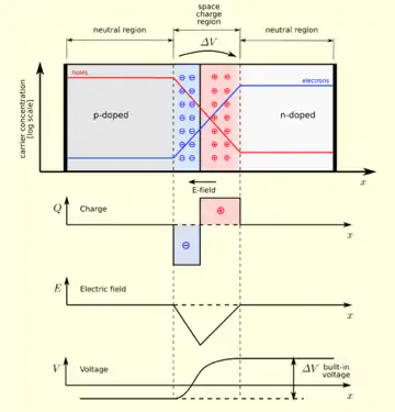 В напівпровіднику p-типу концентрація дірок набагато перевищує концентрацію електронів. В напівпровіднику n-типу концентрація електронів набагато перевищує концентрацію дірок. Якщо між двома такими напівпровідниками встановити контакт, то виникне дифузійний струм — носії заряду, хаотично рухаючись перетікатимуть із тієї області, де їх більше у ту область, де їх менше. При такій дифузії електрони та дірки переносять із собою заряд. Як наслідок, область на границі стане зарядженою. Та область у напівпровіднику p-типу, яка примикає до границі розділу, отримає додатковий негативний заряд, принесений електронами, а погранична область в напівпровіднику n-типу отримає позитивний заряд, принесений дірками. Таким чином, границя розділу буде оточена двома областями просторового заряду протилежного знаку.