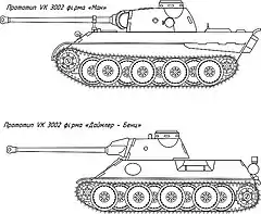 Навесні 1942 року обидва підрядника представили свої прототипи. Дослідна машина фірми «Даймлер-Бенц» всередині та ззовні сильно нагадувала Т-34 — німецькі інженери повністю запозичили компонування з заднім розташуванням моторно-трансмісійного відділення. Також було запропоновано оснастити танк дизельним двигуном, як і в Т-34 хоча гострий брак дизельного палива в Німеччині (воно в переважній більшості йшло на потреби підводного флоту) робив цей варіант малоперспективним. Адольф Гітлер виявляв великий інтерес і прихильність до цього варіанту, фірма «Даймлер-Бенц» навіть отримала замовлення на 200 машин. Проте офіційна приймальна комісія за результатами тестування, яке проводилося на полігоні «Куммерсдорф», анулювала замовлення, перевагу було віддано конкуруючому проекту фірми «MAN». Комісія відзначила такі переваги проекту «MAN», як зокрема — вдалішу підвіску, бензиновий двигун, кращу маневреність, менший виліт гармати. Також висловлювалися міркування, що схожість з нового танка Т-34 призведе до плутанини бойових машин на полі бою і втрат від свого ж вогню.