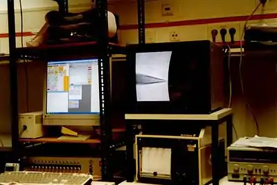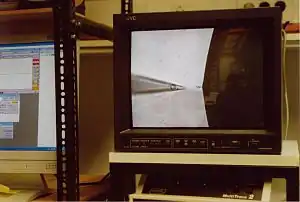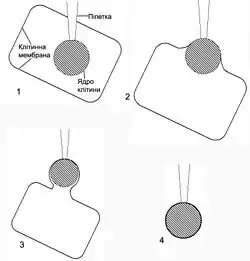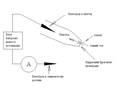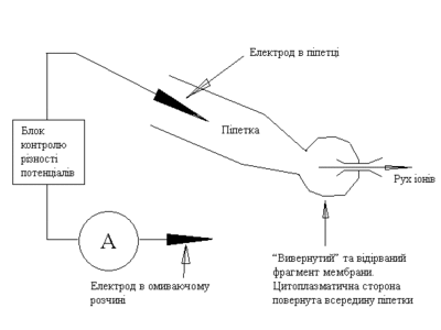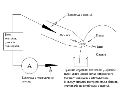 На рисунку 1 зображена частина установки для patch-clamp. Величезна сфера, частину якої видно на моніторі в центрі фотографії — це клітина (ооцит жаби Xenopus laevis), що знаходиться в цей час на предметному столику мікроскопа, до неї підведена patch-піпетка, діаметр якої біля носика становить близько 3 мікрони. Після встановлення gigaseal вона ізолює фрагмент мембрани діаметром близько 3 мкм2, і, якщо в цьому фрагменті трапляться іонні канали, то їхній струм можна буде записувати. Щойно описана конфігурація називається cell-attached patch-clamp. Вона ілюструється схемою, що зображена на рисунку 2.