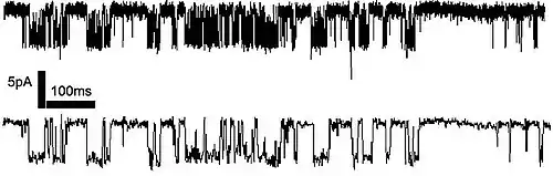 Далі, за наявності такого каналу і потоку іонів крізь нього, буде переноситися і заряд — тобто виникати електричний струм, який можна вимірювати. Провідність одиночного каналу у відкритому стані коливається, в залежності від типу каналу, від 1-2 до 30-50 пікосименсів, тому при різниці потенціалів в 100 мВ спостерігається струм в декілька пікоамперів.