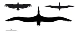 ![]() Силует Pelagornis sandersi у порівнянні з найбільшими сучасними птахами — кондором (ліворуч) та альбатросом (праворуч) | ||||||||||||||||||||||||