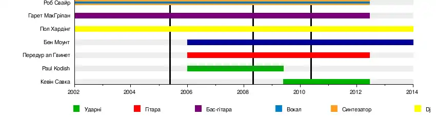 - Гарет МакГрілан — бас-гітара, бек вокал, ді-джей (2002-до тепер)