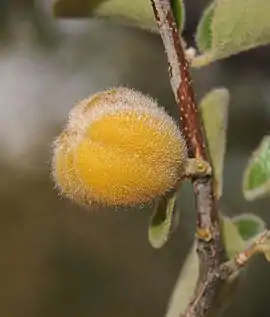 Невелике дерево з густою кроною до 5-12 м заввишки з покрученим стовбуром. Листя вузьке еліптичне 2-6 см завдовжки та 1-2,5 см завширшки з глянцевою поверхнею зверху та сіруватими волосинками знизу. Дерево різностатеве, жовтувато-брунатні чоловічі квіти ростуть у суцвіттях по 3-4, тоді як жіночі окремо. Плід — кістянка, 12-17 мм в діаметрі. У кожній кісточці міститься по 4 насінини.[1]