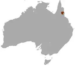 Ендемік північно-східного Квінсленду, Австралія. Діапазон проживання за висотою: 0–1000 м над рівнем моря. Це погано вивчений вид, пов'язаний з областями скелястих пагорбів, скель і ущелин.
