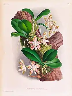 ![]() Phalaenopsis zebrina Ботанічна ілюстрація з книги Lucien Linden & Emile Rodigas «Lindenia Iconographie des Orchidées», 1892 | ||||||||||||||||||||||||