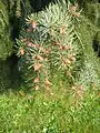Дерево до 40 м заввишки й до 150 см діаметром. Кора від сірого до коричневого кольору, тонка і лущиться. Бруньки сіро-коричневі, 5–7 мм, на вершині закруглені. Повисле листя розвивається тільки тоді, коли дерево виростає приблизно до висоти 1,5–2 м. Листки довжиною 1,5–3 см, сплющені або широко трикутні в поперечному перерізі (нижня поверхня листа округла або злегка кутова), досить жорсткі, нижня поверхня листа темно-зелена, верхня поверхня сиза, вершини тупі (особливо на старих листках). Насіннєві шишки темно-червоно-фіолетові, після дозрівання (5–7 місяців після запилення, у вересні-жовтні) червоно-коричневі, циліндричні, довжиною 6.5–12(14) см. Насіння чорне, 3–4 мм завдовжки, з тонкими, 12–18 мм довжиною світло-коричневими крилами.