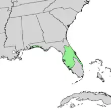 Поширення: США (Алабама, Флорида). Це низовинна (від 5 до 60 м над рівнем моря або до 90 м на західному узбережжі) сосна, що зростає на сильно кислих піщаних ґрунтах морського походження. Кількість опадів та безморозний період великі, причому з жовтня по квітень опадів значно менше ніж у червні, липні і серпні. Зареєстрована температура варіюється в діапазоні від -17 °C до 42°.