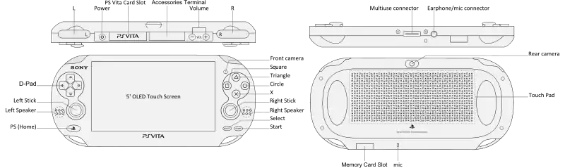 ), бічні кнопки (L, R), 2 аналогових стіка, кнопки Start і Select, кнопки регулювання гучності (+/-); також ємнісні сенсорний екран і задня сенсорна панель з multi-touch. - Комунікації: адаптери IEEE 802.11 b/g/n Wi-Fi і Bluetooth 4.0 + EDR, а також опціональний 3G-модем[9].