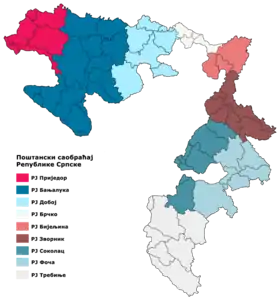На території Республіки Сербської (РС) залишилося 258 поштових відділень та два поштові центри у Бієліні та Баня-Луці. Найбільшими проблемами, які ускладнили створення нової системи РТТ на території РС, були відсутність поштових ліній, відсутність транспортних засобів для доставки пошти, відсутність палива та недостатня потужність поштових центрів.