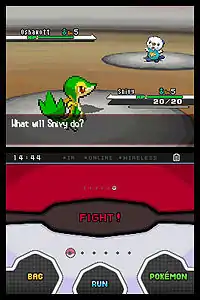 Спочатку тренер володіє одним покемоном, якого обирає з трьох пропонованих варіантів. Покемони, яких тренер носить із собою в покеболах, володіють основними характеристиками: атака, захист, швидкість, особливі сили, тип, очки здоров'я, очки сили, помітка про початкового власника, ідентифікаційний номер. Персонаж може носити з собою не більше шести покеболів, у спеціальних точках обираючи з якими саме істотами всередині. Коли починається бій, карта світу змінюється на арену. Внизу зображається персонаж гравця і обраний ним для битви покемон, зверху — противник. Тренер обирає яку істоту виставити на двобій, вказує яку атаку застосувати, і може підтримати покемона спеціальними предметами, як ліки чи протиотрути. Якщо покемон тренера виграє, він отримує досвід і з часом зможе еволюціонувати в сильнішу форму. Також можна втекти з арени.