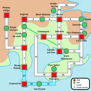 У різних містах гравець буде знаходити місцеві стадіони (англ. Gyms). Усього в Канта є вісім стадіонів, де потрібно перемогти лідера стадіону (англ. Gym Leader) та отримати його значок. Зібравши їх усіх, головному герою відкриється доступ до Ліги покемонів (англ. Pokémon League), де збираються найсильніші тренери покемонів Канто. Для вступу до Ліги хлопчик повинен перемогти «Елітну четвірку» (англ. Elite Four) та чемпіона. Основна сюжетна лінія також включає боротьбу з могутньою злочинною організацією — Командою «R» (англ. Team Rocket).[29][30]