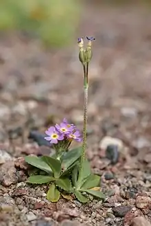 Багаторічна трав'яниста рослина, 5–20 см, але плодові стебла до 35 см. Кореневища дуже короткі. Стебла від прямих до дещо зігнутих, голі, волохаті, вершини стеблин іноді з рідкісними залозистими волосками. Листки у прикореневій розетці, не ароматичні; черешки приблизно такої ж довжини, як пластини, вузькокрилі; пластини тонкі, оберненояйцевиді зі звуженими основами, 1–6 × 0.3–1.1 см, краї цілі або, як правило, з великими зубчастими верхівками, особливо нижня поверхня з рідкісними залозистими волосками. Суцвіття — щільні, 2–8-квіткові парасольки. Квітконіжки прямостійні, тонкі, 1–8 мм, жорсткі. Квіти: віночок воронкоподібний, фіалковий, з жовтим горлом, 4–9 мм шириною, 5-лопатевий; чашечка дзвоноподібна, темно-плямиста, внутрішня поверхня із залозистими волосками; тичинок 5. Плоди — 5-клапанні, яйцевидо-еліпсоїдні, 5–8 мм довжини капсули. Насіння сітчасте.