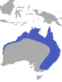 Країни поширення: Австралія (по всій території, але особливо багато на півночі), Папуа Нова Гвінея (час від часу). Висота поширення варіюється від рівня моря до 300 м над рівнем моря. Цей вид зустрічається в склерофільних лісах, бамбукових, мангрових лісах, а іноді й у садах.