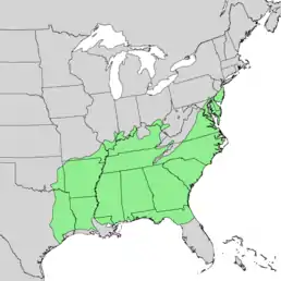 Ендемік південного сходу й центрального сходу США: Міссісіпі, Меріленд, Луїзіана, Кентуккі, Індіана, Іллінойс, Джорджія, Флорида, округ Колумбія, Делавер, Арканзас, Західна Вірджинія, Вірджинія, Техас, Теннессі, Південна Кароліна, Пенсильванія, Оклахома, Огайо, Північна Кароліна, Нью-Джерсі, Міссурі, Алабама, Нью-Йорк[3].