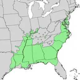 Зростає у південно-східній і центрально-східній частинах США: Міссурі, Міссісіпі, Меріленд, Луїзіана, Кентуккі, Індіана, Іллінойс, Вірджинія, Техас, Теннессі, Південна Кароліна, Оклахома, Північна Кароліна, Нью-Джерсі, Алабама, Арканзас, округ Колумбія, Флорида, Джорджія[2].