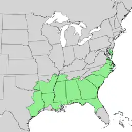 Поширений на південному сході США: Нью-Джерсі, Міссурі, Міссісіпі, Меріленд, Луїзіана, Кентуккі, Вірджинія, Техас, Теннессі, Південна Кароліна, Оклахома, Північна Кароліна, Алабама, Арканзас, Делавер, округ Колумбія, Флорида, Джорджія[2].
