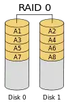 Технологія RAID 0 також відома як розподіл даних (англ. data striping). Із застосуванням цієї технології інформація розбивається на шматки (фіксовані обсяги даних, зазвичай називаються блоками). Ці шматки записуються на диски та читаються з них паралельно. З погляду швидкодії це означає дві основні переваги: