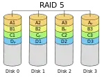 Дана технологія добре підходить для випадків, коли працюють з невеликими обсягами даних, наприклад, для систем обробки транзакцій. Мінімальна кількість дисків для реалізації RAID 5 - 3.