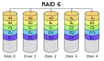 RAID 6 - схожий на RAID 5, але має вищий ступінь надійності - три диски даних і два диски контролю парності (використовується для захисту від подвійних несправностей). Забезпечує працездатність після одночасного виходу з ладу двох дисків - захист від кратної відмови. Зазвичай використання RAID-6 викликає приблизно 10-15% падіння продуктивності дискової групи, порівняно з RAID 5, що викликано великим обсягом обробки для контролера (необхідність розраховувати другу контрольну суму, а також читати і перезаписувати більше дискових блоків при запису кожного блоку).