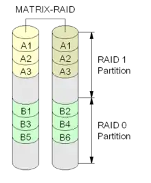Matrix RAID - це технологія, реалізована фірмою Intel в південних мостах своїх чипсетів, починаючи з ICH6R. Ця технологія не є новим рівнем RAID (і її аналог існує в апаратних RAID-контролерах високого рівня), вона дозволяє, використовуючи невелику кількість дисків, організувати на різних розділах цих дисків одночасно кілька масивів рівня RAID 1, RAID 0 і RAID 5. Це дозволяє за порівняно невеликі гроші забезпечити для одних даних підвищену надійність, а для інших - високу продуктивність.