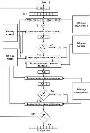 - XOR між двома байтами отриманої в правій половині і двома байтами з таблиці масок. Отримані два байти — покажчики двох таблиць анклаву.