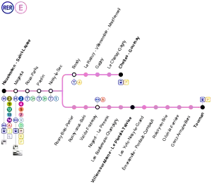 Лінія проходить від західної кінцевої точки Осман — Сен-Лазар (E1) до східної кінцевої точки Шель-Гурне (E2) і Турнана (E4). Під орудою SNCF.