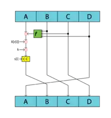 Для визначення порядку 32-бітних слів в повідомленні в кожному раунді використовуються різні комбінації функцій перестановок.