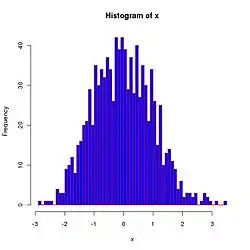 > histogram <- hist(x, breaks=50, plot=FALSE) # розрахунок гістограми для змінної x,