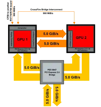 Це покоління чипів з подвійними графічними процесорами зберігає використання мосту PCI Express, PLX PEX 8647 з розсіюванням потужності 3,8 Вт, включаючи підтримку PCI Express 2.0, що дозволяє використовувати два графічні процесори в одному слоті PCI Express із подвоєною пропускною здатністю в порівнянні з минулим поколінням продуктів (Radeon HD 3870 X2). Наступні покоління дизайну з двома графічними процесорами також мають з’єднання для обміну даними між відеочипом через реалізацію CrossFire X SidePort на кожному GPU, що забезпечує додаткові 5 Гб/с повнодуплексної пропускної здатності між GPU. Ці дві функції збільшують загальну пропускну здатність для конструкцій з двома графічними процесорами до 21,8 ГБ/с.