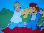 А Гомер і Снейк виїхали з міста, де Снейк починає бити Гомера, а Гомер б'є Снейка під ребра, проте це не заспокоює злодія. Снейк душить Гомера, а Гомер тисне на гальма.Він зі Снейком падає на дах машини, де Гомер перехоплює ініціативу бійки, і боляче б'є Снейка ліктем в пах.Звільнившшись, Гомер б'є Снейка в щелепу 5 разів.Їхню бійку помічає шеф Віггам і їде за ними, а Гомер про швидкому проїзді біля машини Віггама вибиває Снейку зуб (видно у стоп-кадрі). Мардж тим часом говорить із Фландерсами, і у будинок врізається машина зі Снейком і Гомером, який коліном добивав пораненого Снейка.Будинок повністю завалюється, а Гомер із Віггамом граються пластиком.Потім можна побачити Снейка, який має численні розриви судин від ударів Гомера, синець на оці і вибиті зуби.Якщо Гомер майже не постраждав, то Снейк був сильно скалічений і був побитий Гомером по «усім статтям». За заподіяну шкоду Мардж звільняють з роботи і вона знову їде на біржу праці, щоб десь влаштуватися.На біржі можна побачити і сина Бернса — Ларрі і Гіла Гандерсона.