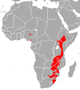 Країни проживання: Ботсвана, Камерун, Кот-д'Івуар, Ефіопія, Гвінея, Кенія, Ліберія, Малаві, Мозамбік, Нігерія, ПАР, Судан, Свазіленд, Танзанія, Уганда, Замбія, Зімбабве. Цей вид зазвичай пов'язаний з печерами в районах вологих саван.